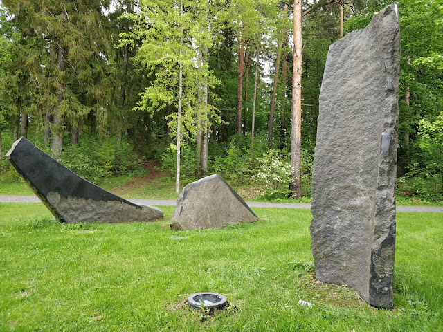 Kuvanveistäjä Timo Hannunen on syntynyt Multialla vuonna 1969. Hän on käynyt Limingan ja Kankaanpään taidekoulut ja käyttää materiaalinaan graniittia. Hän asuu ja työskentelee Keuruun Haapamäellä. Hänen teoksistaan olen esitellyt aiemmassa postauksessani "Hauskaa Vappua" 30.4.19 kaksi: Kuokkalan kiertoliittymässä olevan Hallan ja Vaajakoskelle sijoitetun Ajan.
